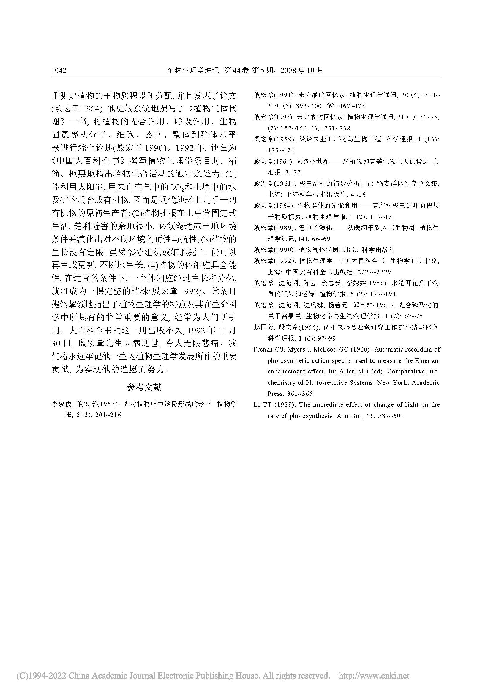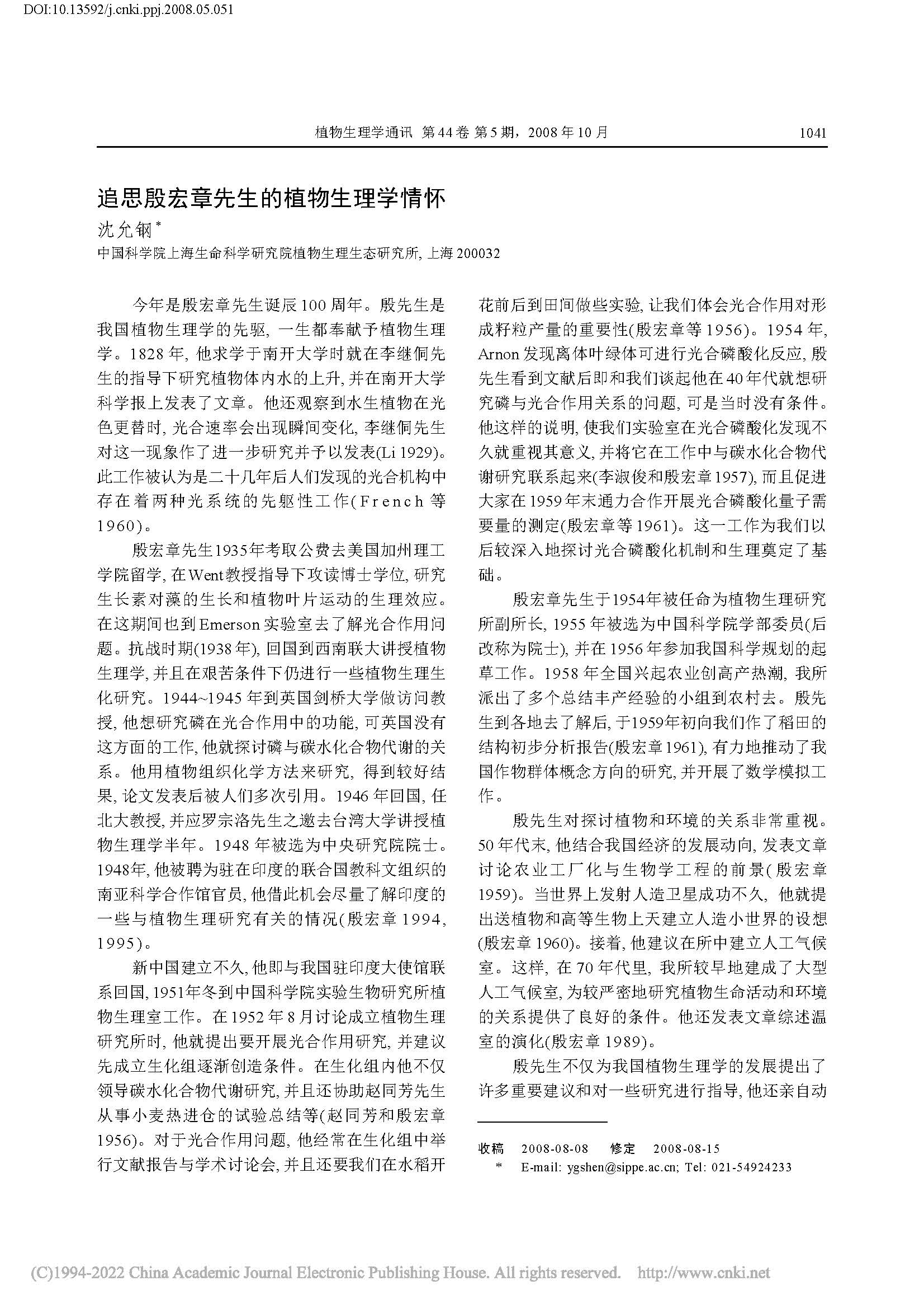 追思殷宏章先生的植物生理学情怀(植物生理学通讯)