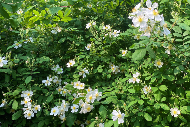 漫步辰山植物园矿坑花园,顺着花园南侧步道前行,在密密匝匝的绿荫下,白花丛丛,近看花瓣单薄而略显柔弱,这便是野蔷薇(拉丁学名:Rosa multiflora),花期比常见的蔷薇要早半个多月。比起开在初夏、花色艳丽的蔷薇,野蔷薇开得似乎有点寂寞,少有人问津,但这并不妨碍她的恣意生长。