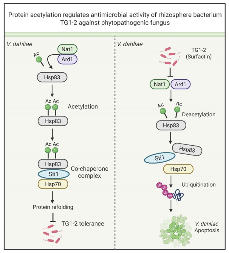 本研究报道了一种根际细菌——解淀粉芽孢杆菌菌株TG1-2,它对多种植物病原真菌和卵菌表现出广谱抗菌活性,代谢组学分析发现其主要抗菌活性物质为表面活性素Surfactin。在该研究中,作者利用棉花黄萎病的主要致病菌——大丽轮枝菌(Verticillium dahliae)创建了T-DNA插入突变体库,筛选对TG1-2敏感性发生变异的菌株,从中鉴定到NatA乙酰转移酶复合物组分突变体,该突变体对TG1-2的敏感性显著增强,而过表达则表现出相反的效果。作者发现TG1-2能够显著抑制NatA复合物的蛋白积累,进而抑制大丽轮枝菌整体乙酰化水平。