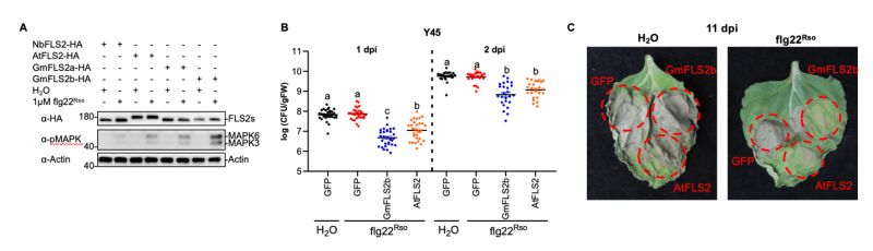 在本研究中,作者发现通过将拟南芥FLS2转入本式烟草(Nicotiana benthamiana)后,该植物获得了识别flg22Rso的能力,并能激活免疫信号通路。异源表达的AtFLS2可与本式烟草中的内源SERK蛋白(NbSERKs)相互作用,形成功能性受体复合物。这种互作激活免疫反应并限制细菌增殖,证明AtFLS2介导的flg22Rso识别足以激起保护性免疫反应。