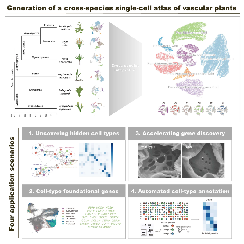 接下来,王佳伟研究组通过四个应用场景证明了该整合细胞图谱的独特优势和重要性。首先,他们在蕨类和裸子植物中发现了以前从未发现的新细胞类型,即韧皮部中的类伴胞细胞(companion cell-like cells)。其次,基于跨物种保守性和基因表达模式相似性,首次揭示了维管植物各类细胞的底层基因集。尤为重要的是,已知的拟南芥各类细胞类型的关键调控基因大部分都可以在这个底层基因集中找到。此外,研究团队通过两个案例证明维管植物底层基因集的发现能够有效应对当前基因挖掘中的瓶颈问题,高效发现全新的发育基因。最后,他们以各类细胞底层基因集为参考,开发了一个维管植物通用的细胞类型自动化注释工具(automated cell-type annotation tool),能够在短时间内对一个未知图谱进行初步注释。