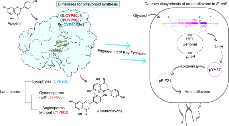 图1 裸子植物特有的 P450 酶 CYP90Js 能够高效催化芹菜素分子间特定位点的 C–C 偶联,生成穗花杉双黄酮,揭示了植物双黄酮合成的分子基础与进化起源。该合成通路已成功在工程化大肠杆菌中重建,实现了穗花杉双黄酮的从头合成。