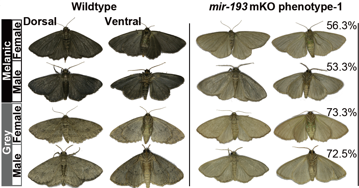 在分子水平,通过开展经典遗传学和群体基因组学分析,研究团队发现我国不同地域茶尺蠖种群的黑化位点均发生在Cortex基因座的附近,与远在万里之外的英国桦尺蠖的黑化位点高度同源,但彼此系多次独立起源;提示该基因座是蛾类昆虫黑化的“热点区域”。此外,本研究通过基因编辑等手段,首次在蛾类昆虫中证实了在该热点区域内发挥核心功能的也是先前在蝴蝶中发现的隐藏其中的非编码RNA(mir-193;Tian et al. 2024)(图3)。
