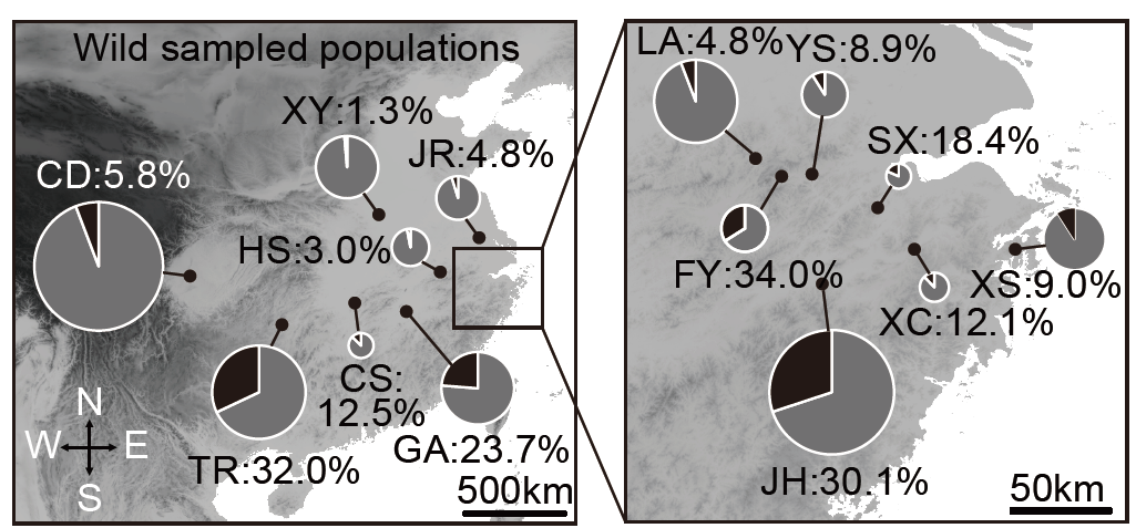 图4:田间调查显示黑色型茶尺蛾在自然界维持较低比例,且受纬度分布影响。