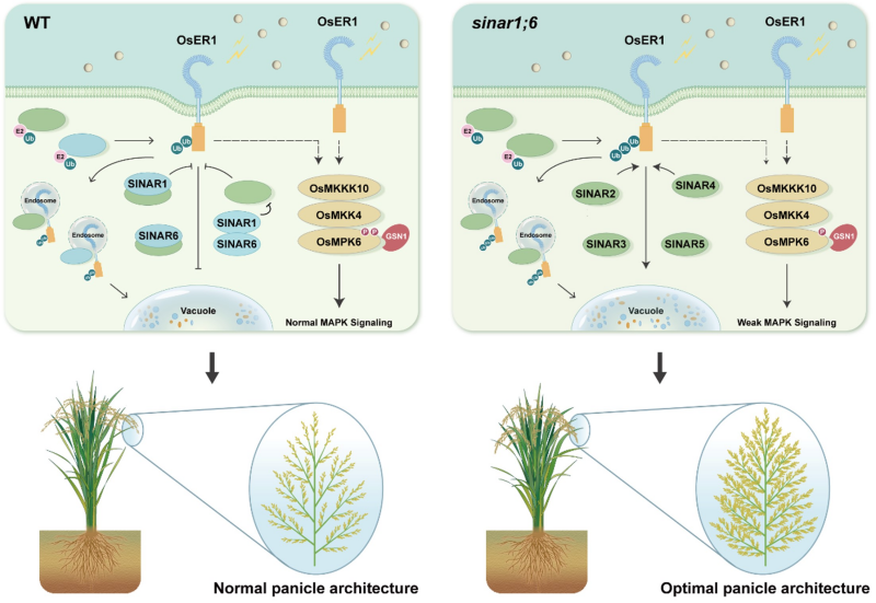 图3. 水稻E3泛素连接酶家族SINARs通过二元调控类受体激酶OsER1稳态控制作物花序形态建成的分子遗传机理示意图