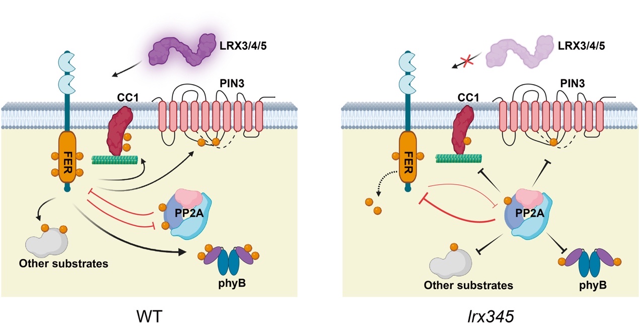 研究人员发现LRX3/4/5的缺失会导致FER磷酸化水平及其激酶活性显著下降,说明LRX3/4/5是维持FER激酶所必需的。利用免疫共沉淀结合质谱技术,发现FER与磷酸酶PP2A复合体的多个亚基存在相互作用,并且该互作通过荧光素酶互补实验、免疫共沉淀实验以及双分子荧光互补技术得到进一步证实。进一步研究显示,PP2A复合体能够去除体外FER激酶结构域的磷酸化修饰并抑制其激酶活性,而PP2A磷酸酶抑制剂斑螯素(Cantharidin)处理或者PP2A亚基突变均可提升体内FER的磷酸化水平。这些研究结果表明PP2A磷酸酶介导FER的去磷酸化。斑螯素处理可以回补lrx345突变体中降低的FER磷酸化水平及激酶活性,并且该处理能够显著恢复lrx345突变体的耐盐性缺陷,表明lrx345突变体对盐胁迫敏感的表型很大程度是由于FER的激酶活性下降造成的。