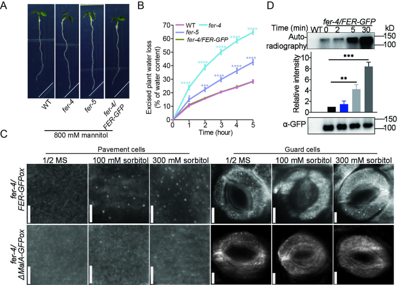 图1 渗透胁迫诱导依赖于MalA的FER纳米结构域形成及激酶活性增强。