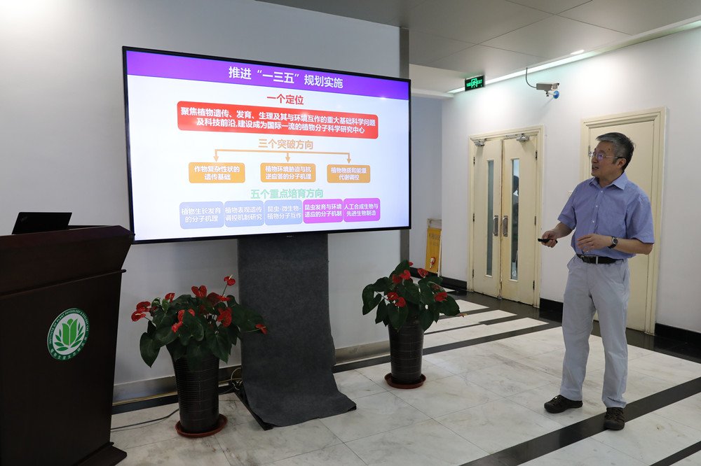 韩斌所长就研究所整体情况做了汇报,主要围绕研究方向、学科布局、体制改革、科研产出、国际合作、人才队伍等方面介绍了研究所定位及未来发展目标。他指出,研究所通过聚焦分子植物科学、瞄准精准设计育种,不断涌现重大原创成果、主动争取国家重大项目、努力拓展各类国际合作、积极融入上海科创中心建设、显著提升研究所的国际地位及影响力、以科技创新引领国际植物发展。曹健林认真听取汇报并对研究所在国际植物领域的领先地位给予充分肯定。