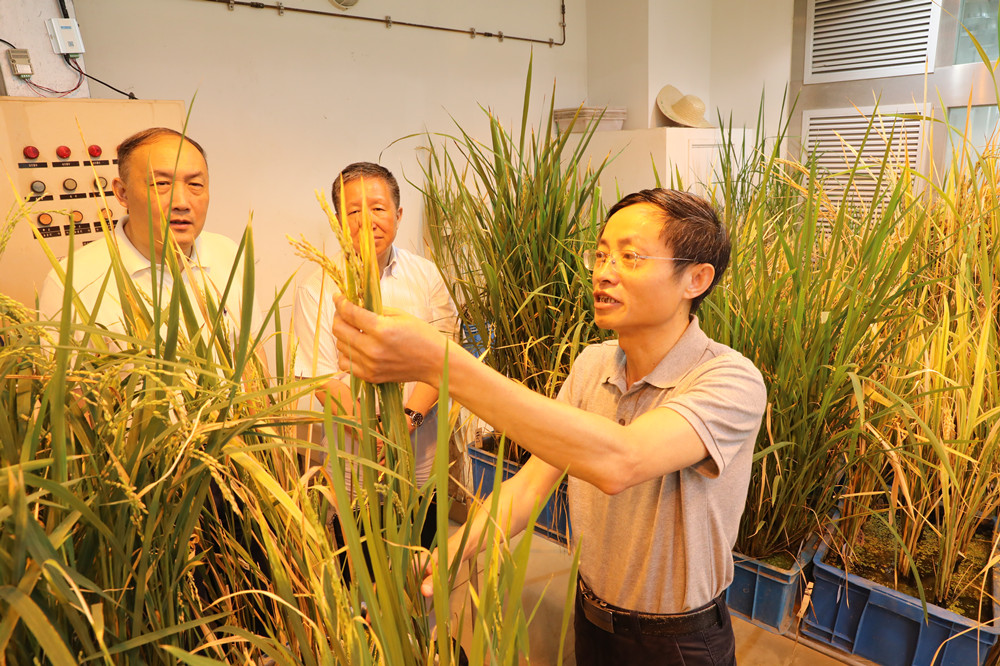 随后,曹健林一行参观了人工气候室的自然光照培养室以及具有代表性的部分可控单元,其中包含转基因抗虫棉花和长纤维棉花、广谱持久抗病水稻、能够高效利用木质纤维资源的杨树、抗病抗虫转基因玉米、服务我国“一带一路”建设的块根类作物红薯和木薯以及模式植物拟南芥等多项科研成果,期间与科研人员亲切交流。韩斌介绍,人工气候室包含95个可控单元,可以根据不同种类植物精确地模拟他们生长所需的光、温、水、气等环境因子,为植物生长提供最佳的人工条件,缩短植物培养周期,有效提高科研效率,为研究所科研工作提供有力的支撑。