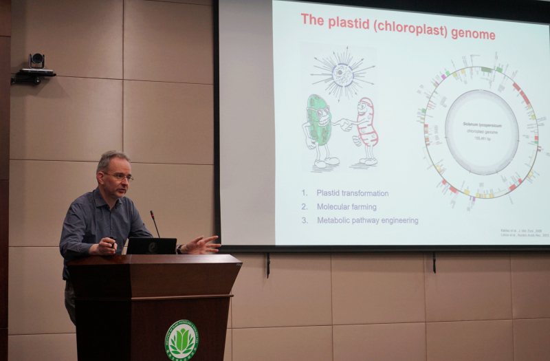 学术交流会由王佳伟研究员主持。Ralph Bock教授做了题为“Taming chloroplasts for biotechnology and synthetic biology”的报告,介绍了他实验室在植物质体转化技术和应用领域的研究进展,用一个个生动的例子展示了将植物质体改造成生物工厂的巨大潜力。会后王佳伟研究员为Ralph Bock教授颁发了嘉许证书,感谢他给全体师生带来的精彩报告。