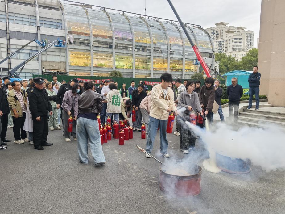 随着烟雾升起,1号楼内响起火警警报及消防广播,园区消防值班室接到报警电话,保安队员迅速前往确认火情,引导楼内人员迅速疏散。义务消防员携带灭火器材赶往现场迅速控制火情。疏散完毕后,参演人员开展了灭火器操作演练。在现场工作人员的指导下,大家依次有序体验使用灭火器灭火操作。11月7日,辰山园区也开展了消防疏散及灭火演练。
